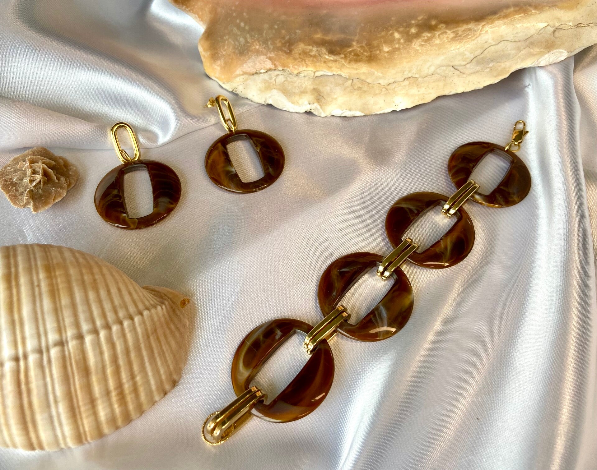 Pendentifs upcyclés motif marbré chocolat et beige.